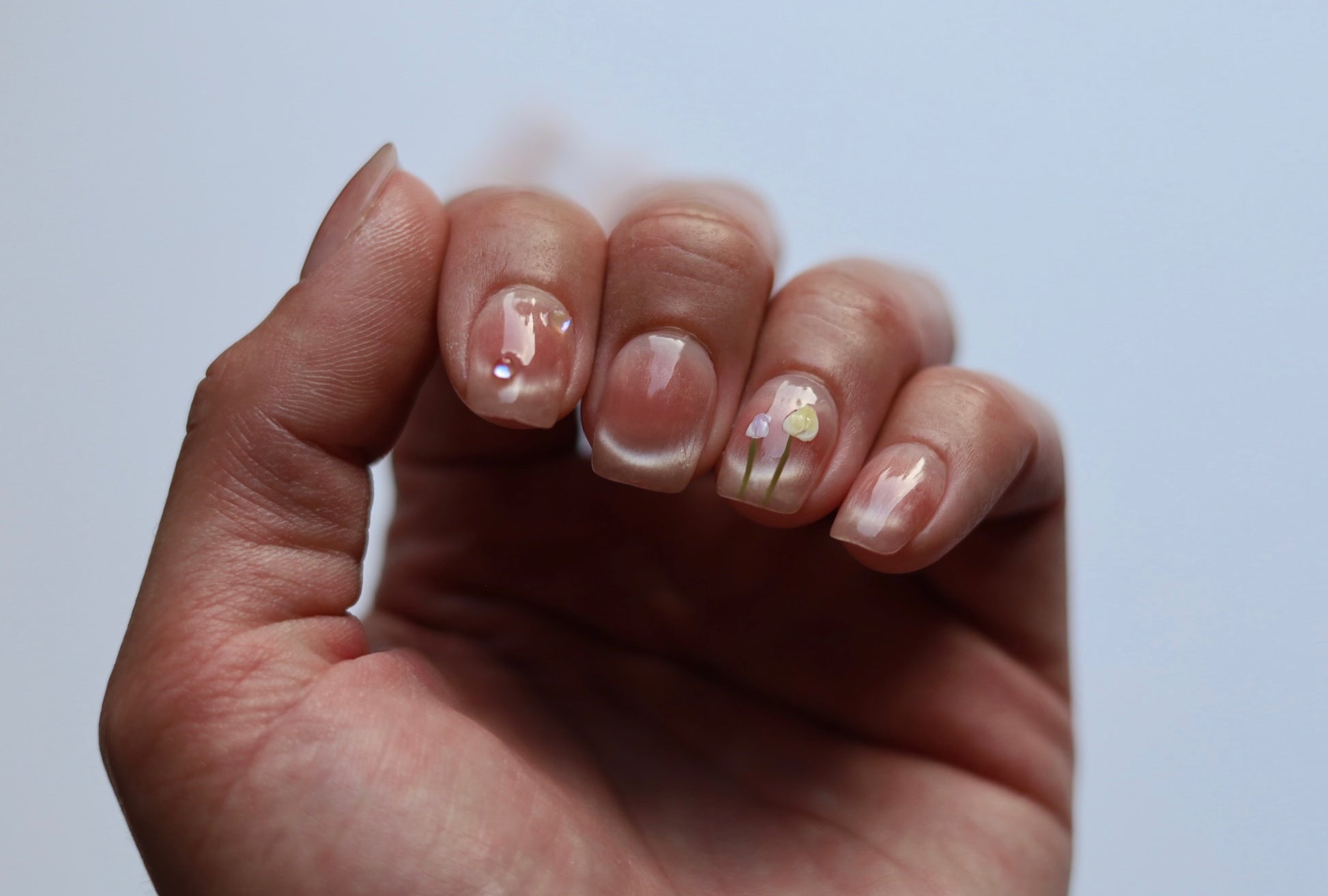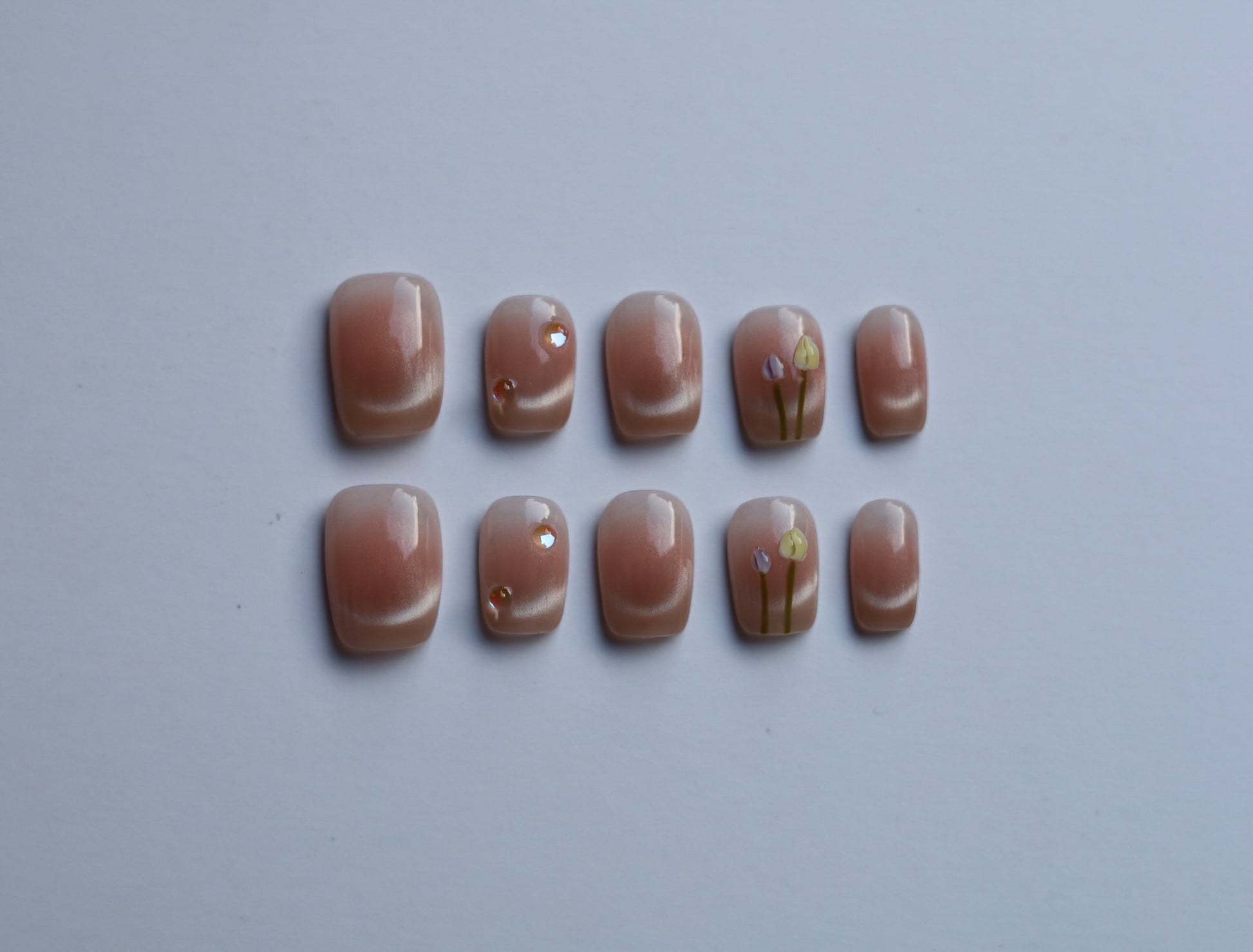 A delicate nude shimmer decorated with hand-painted floral accents and crystal details. This design brings the charm of a blooming garden into your daily style — feminine, graceful, and softly enchanting.